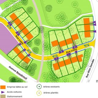 - Production d’un projet d’organisation de la résidentialisation et de gestion des espaces extérieurs avec le bailleur social ; élaboration de plans fonciers permettant de réorganiser le foncier,
