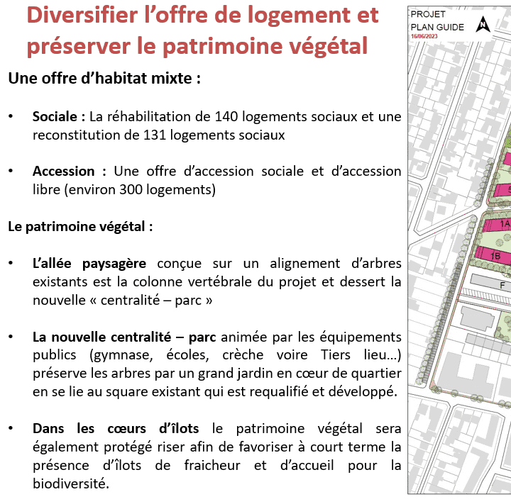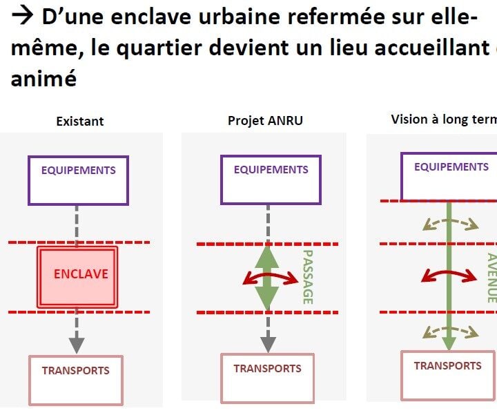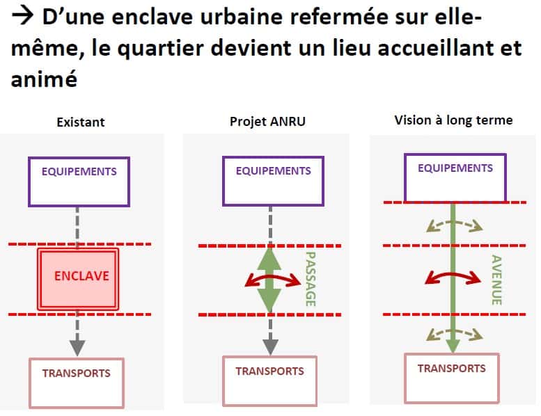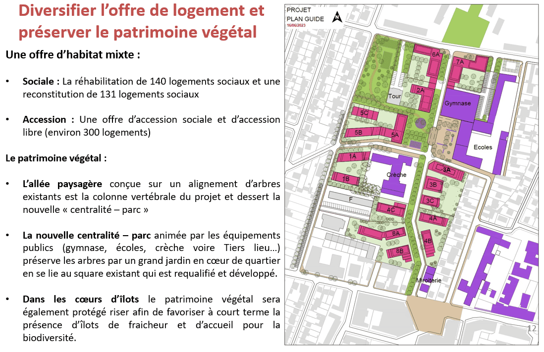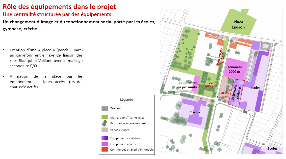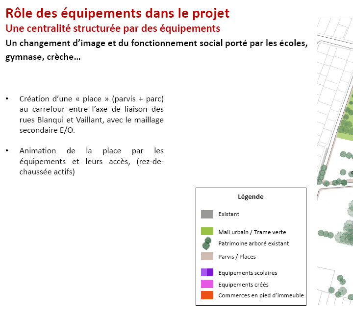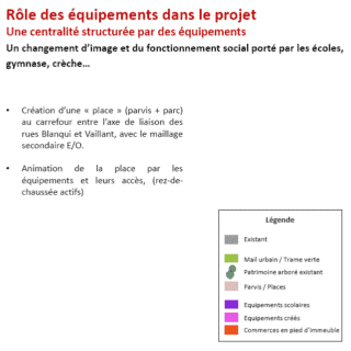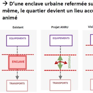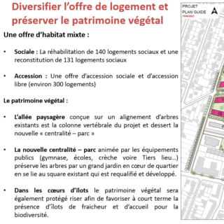 - Reprise intégrale du 1er plan guide abandonné et approfondissement pour la mise en œuvre des opérations de construction. Proposition d’un aménagement urbain structurant les traversées Est-Ouest et Nord-Sud du quartier via une requalification des axes. Elaboration d’une centralité organisée par les équipements scolaires et sportifs visant à changer à la fois l’image et le fonctionnement social.